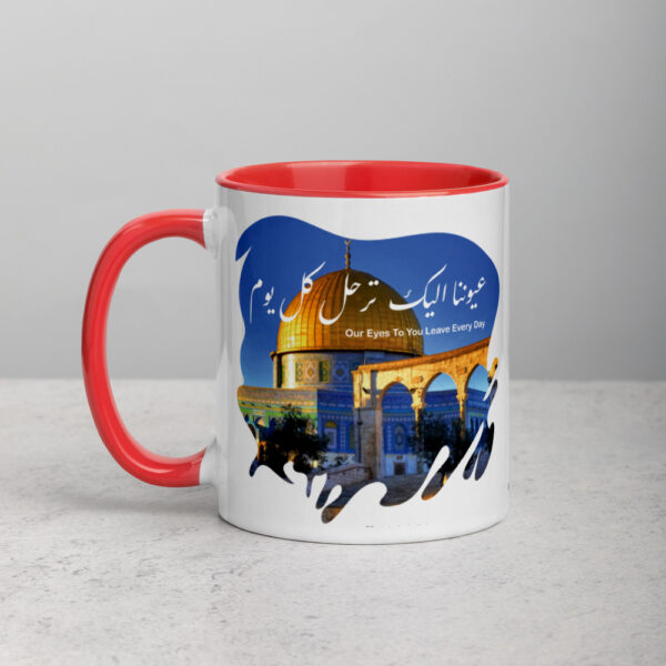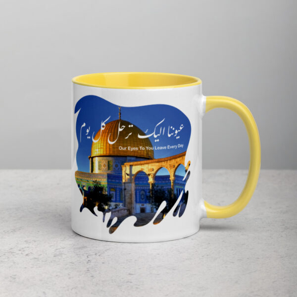 Show your love and support while adding a splash of color to your morning coffee or tea ritual with a unique design and message like this Palestine dome of the rock arabic calligraphy art. These quality mugs come with a colored rim, handle and inside.