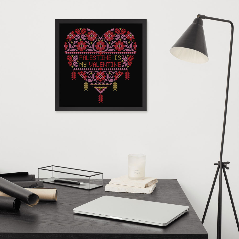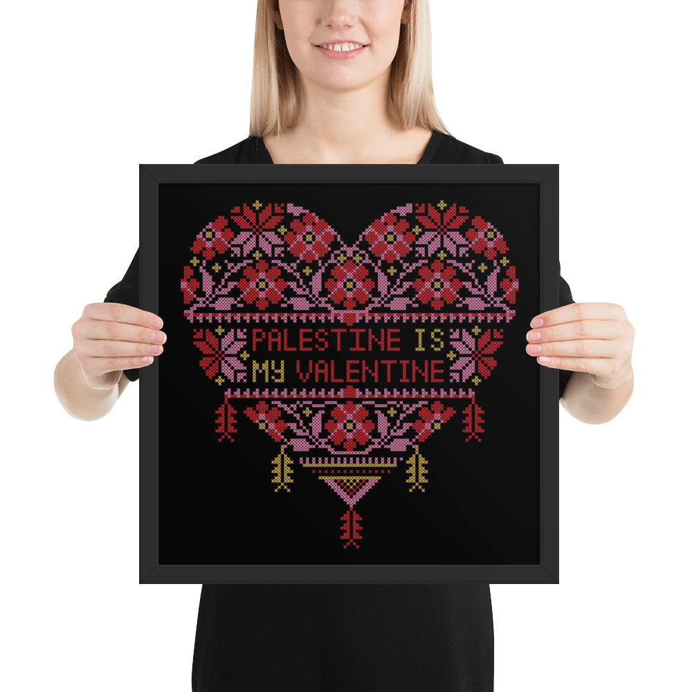 Make a statement in any room with this Palestine is my Valentine framed poster customized with beautiful pink red embroidery folk art, high resolution vivid print on thick, durable, matte paper. The matte black frame that’s made from wood from renewable forests adds an extra touch of class.