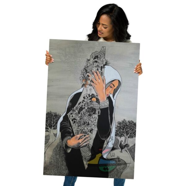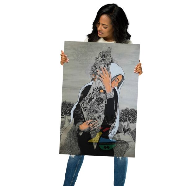 Show your love and support for Palestine freedom, add a meaningful art to your room or office. This Palestine map Palestinian woman metal print is a dimensional and high-quality piece of art that stands the test of time while remaining easy to clean and care for. The artwork looks luminescent against the wall and the metal base means it’ll last a long time.