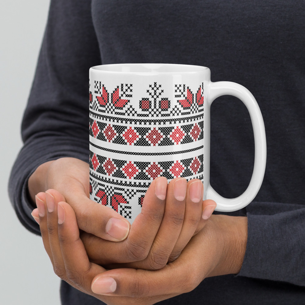 Beautifully customized sturdy and glossy coffee mug in realistic Palestinian Jordanian Tatreez art with a high resolution vivid print that’ll withstand the microwave and dishwasher.