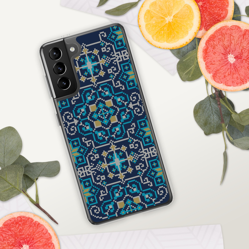 This sleek Palestinian traditional Tatreez Samsung phone case customized with vivid realistic traditional embroidery pattern protects your phone from scratches, dust, oil, and dirt. It has a solid back and flexible sides that make it easy to take on and off, with precisely aligned cuts and holes. A very precious piece of cross-stitch art, a great gift to every Palestinian and Palestine lover.