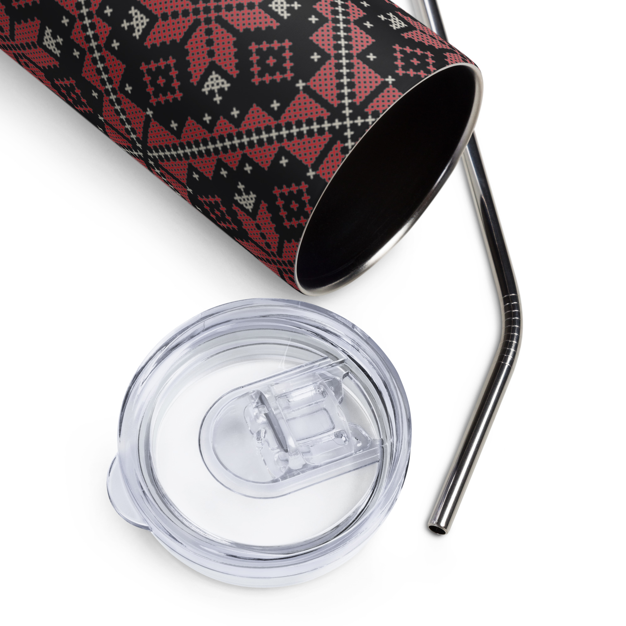 Enjoy hot or cold drinks on the go with this stylish Palestinian embroidery pattern Tatreez art stainless steel tumbler! This reusable tumbler with a metal straw is a perfect combo for hot or cold drinks at any time of the day.